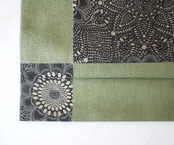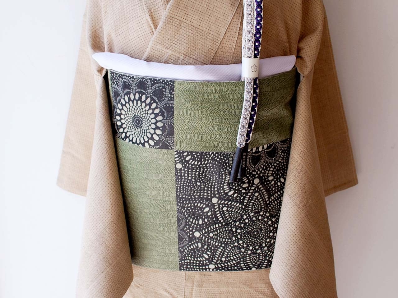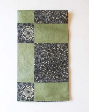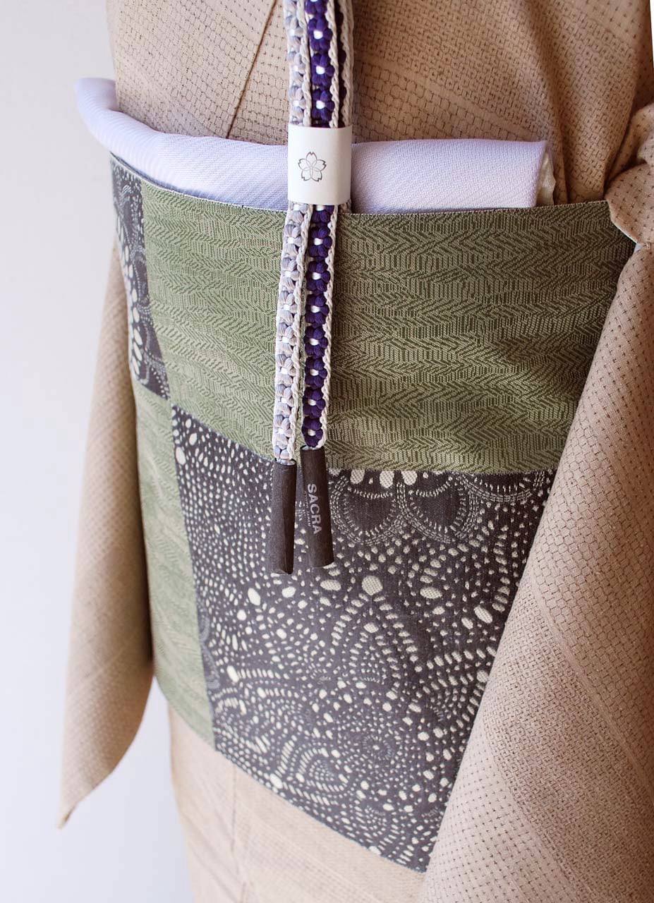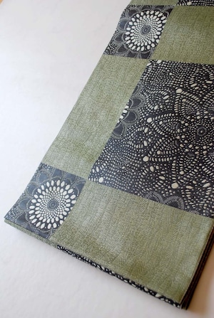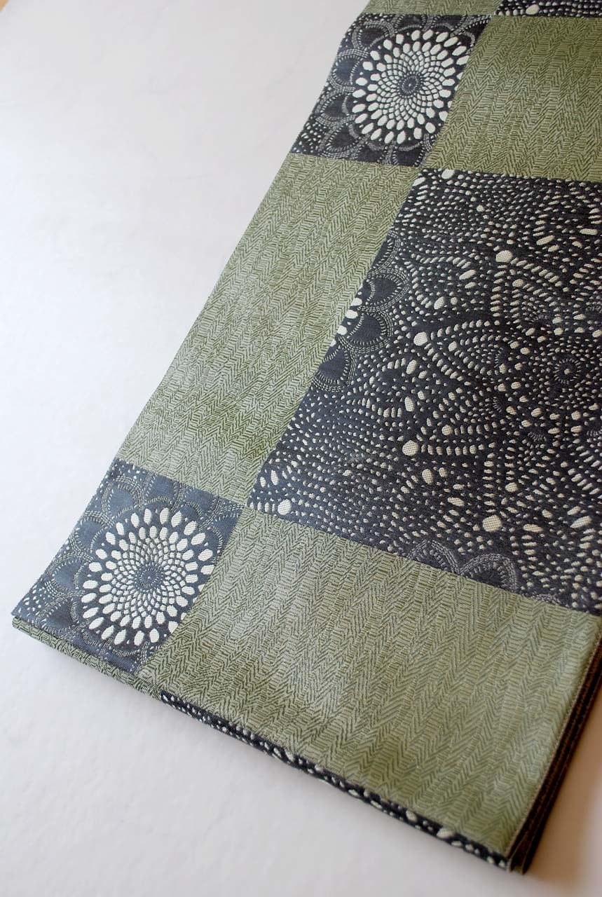 老竹色地、市松取りに抽象花文のふくろ帯です。