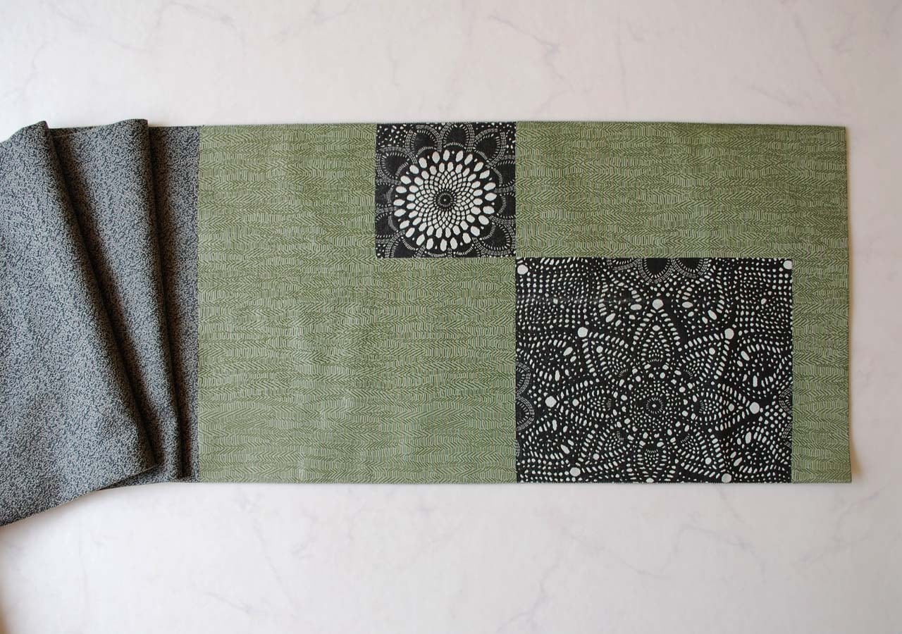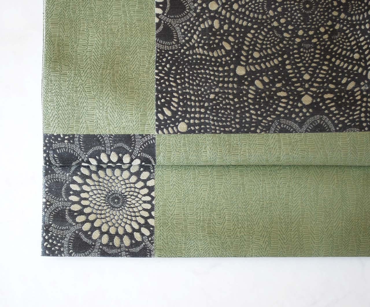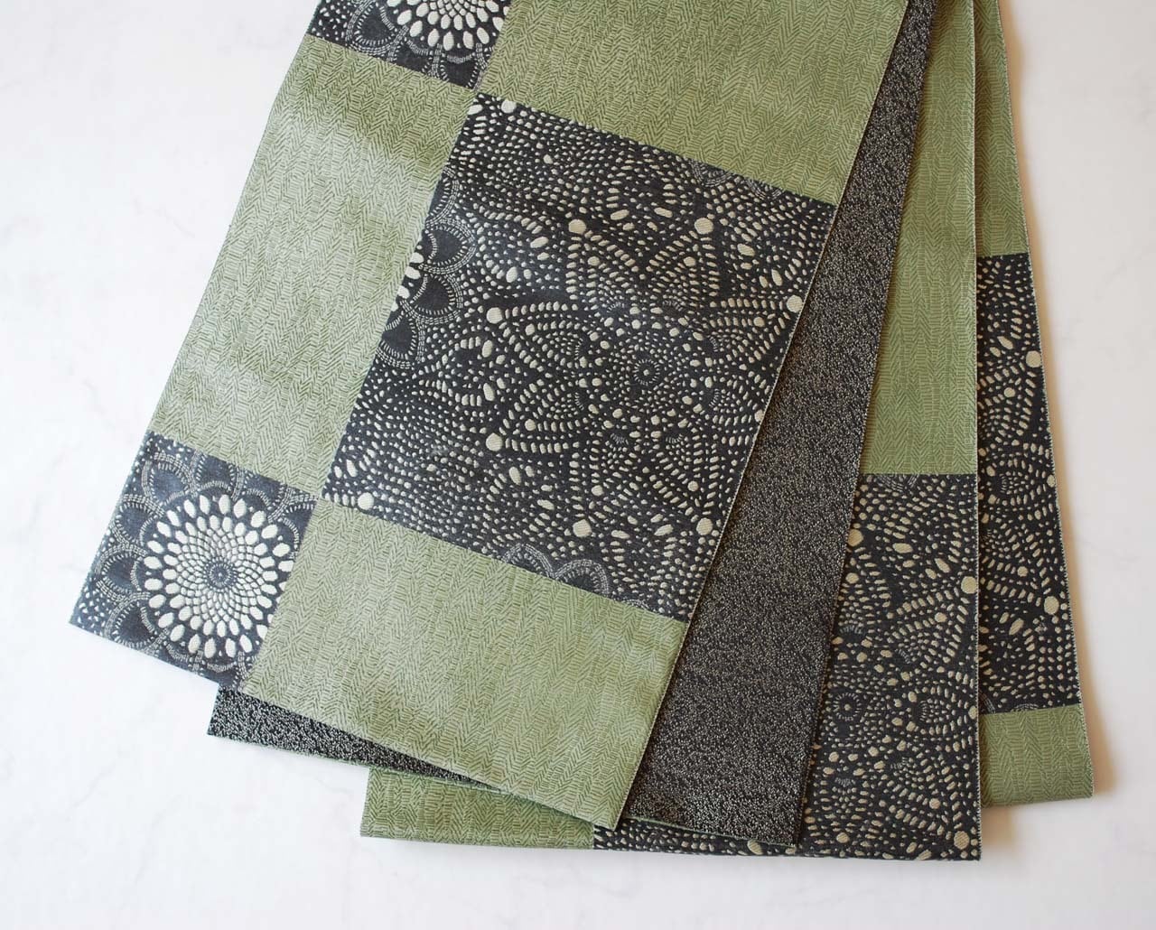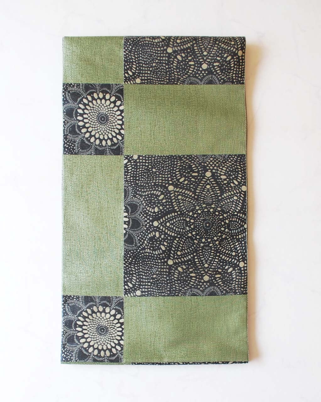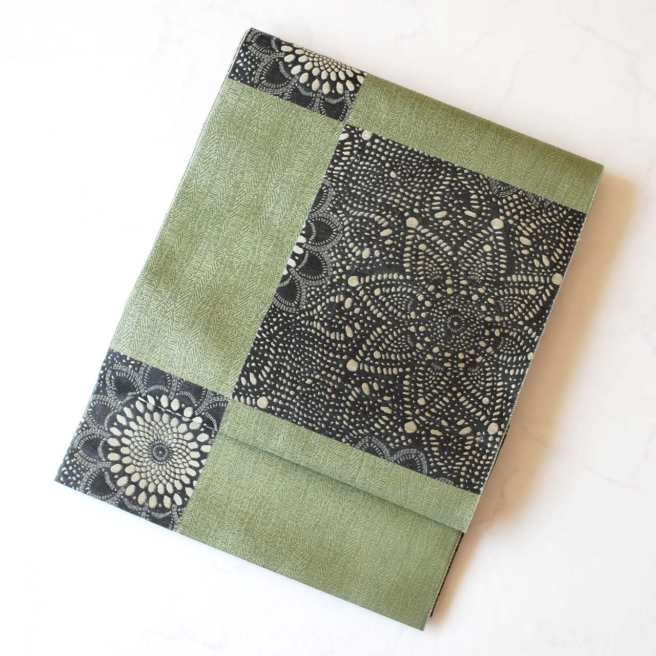 【ふくろ帯】長嶋織物 老竹色地 市松取りに抽象花文 ふくろ帯