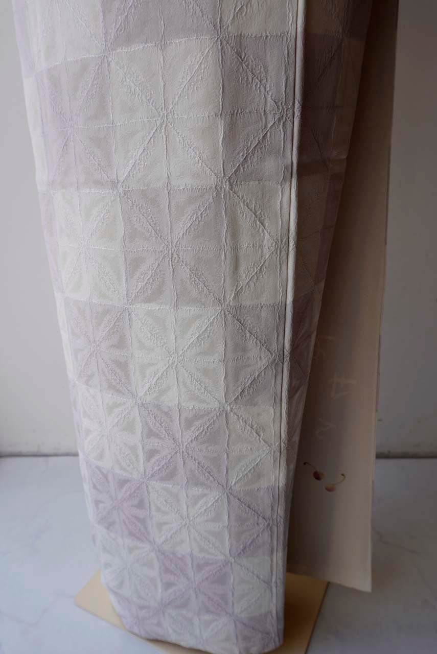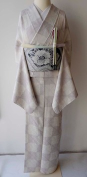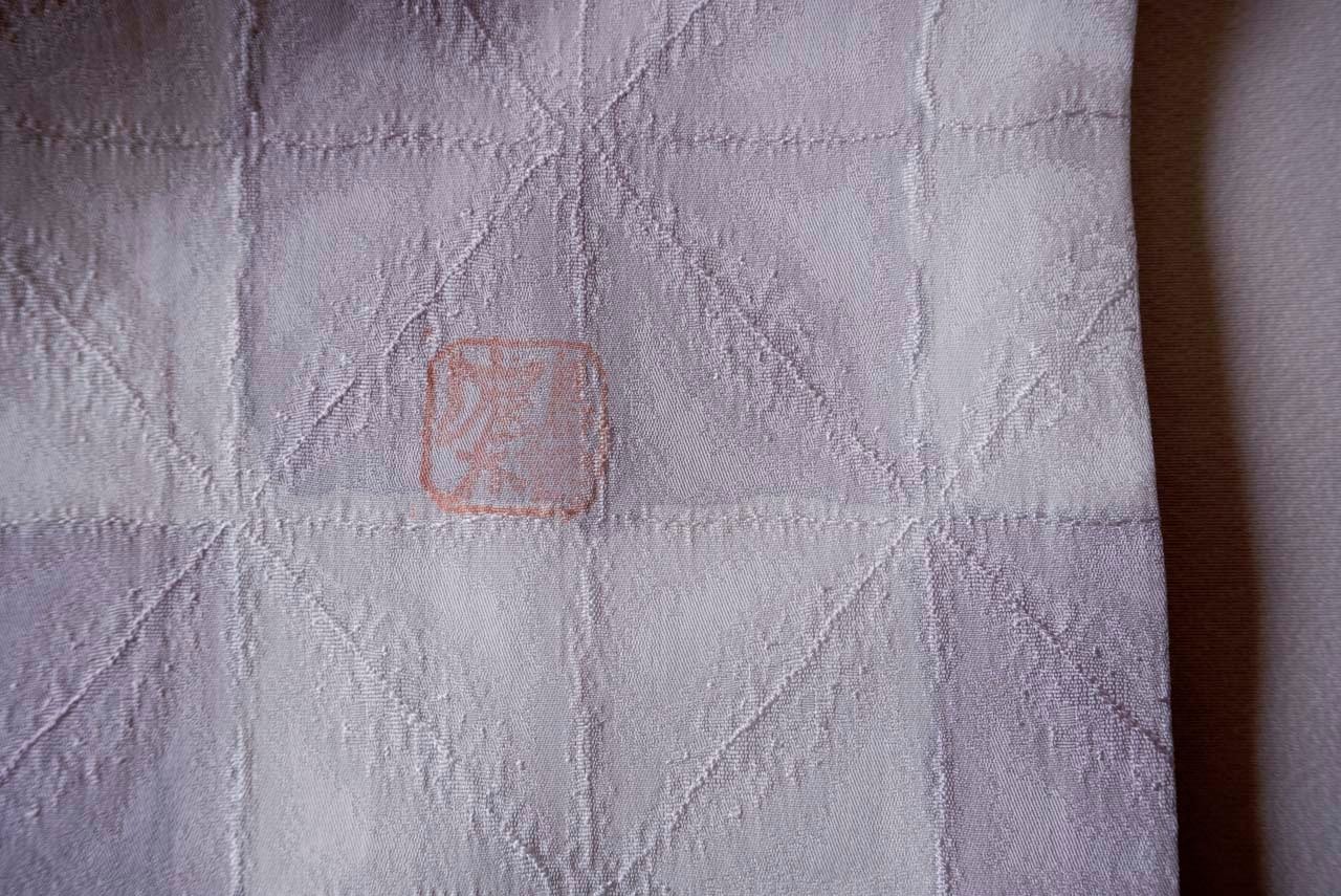 桜色と白藤色の優しいお色味の市松文の小紋です。