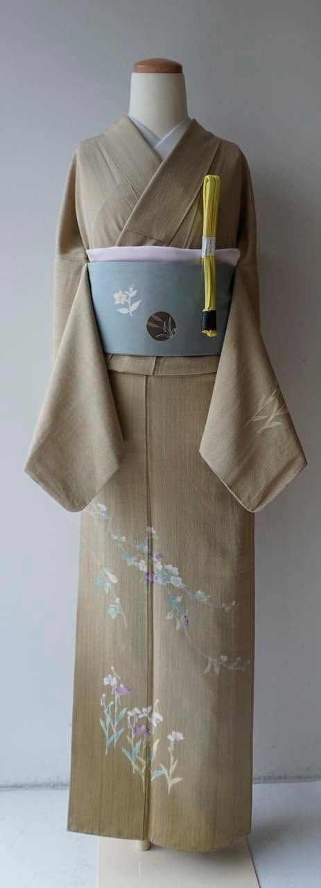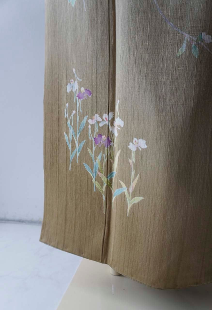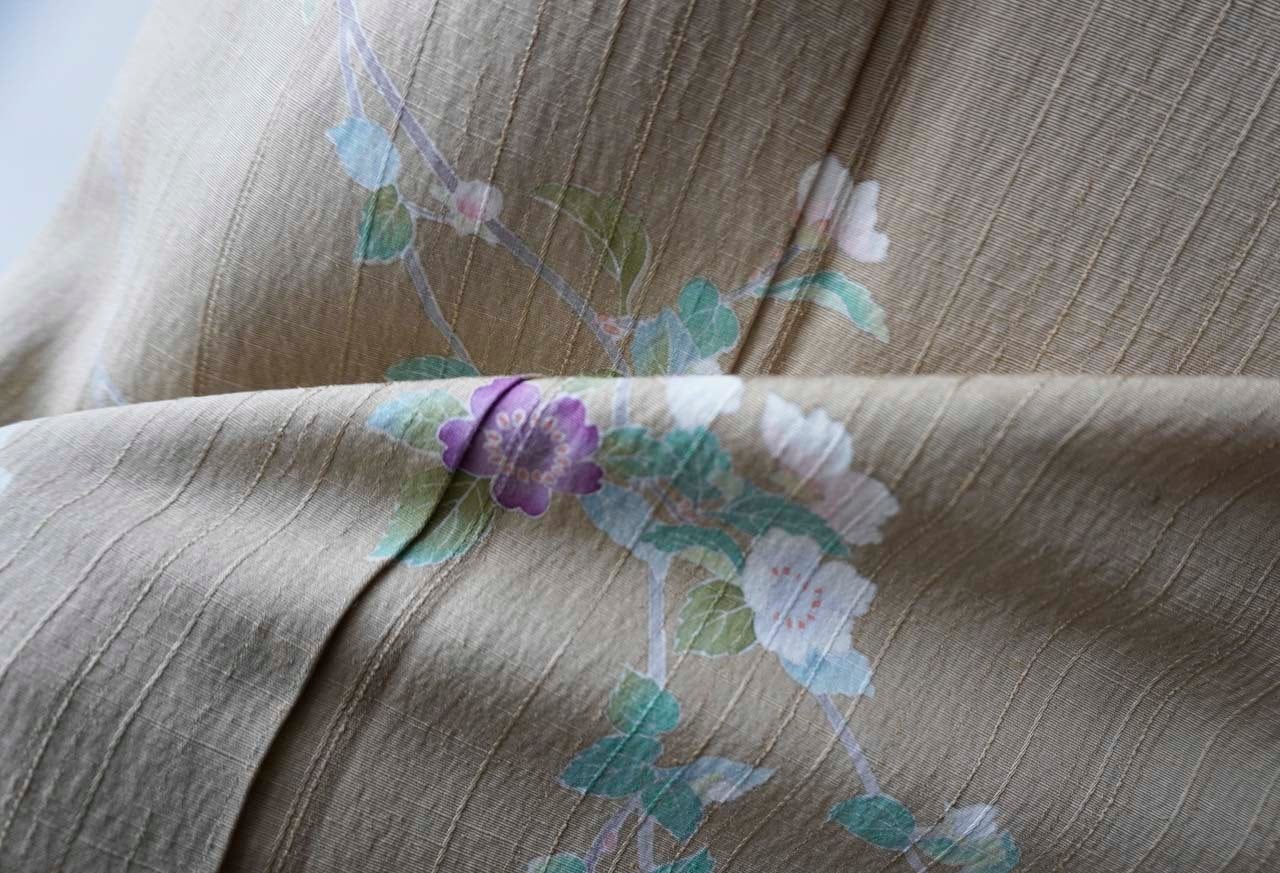 【袷】遠田藤舟 利休茶色地 桜に鷺草文 紬附下 胴抜仕立て