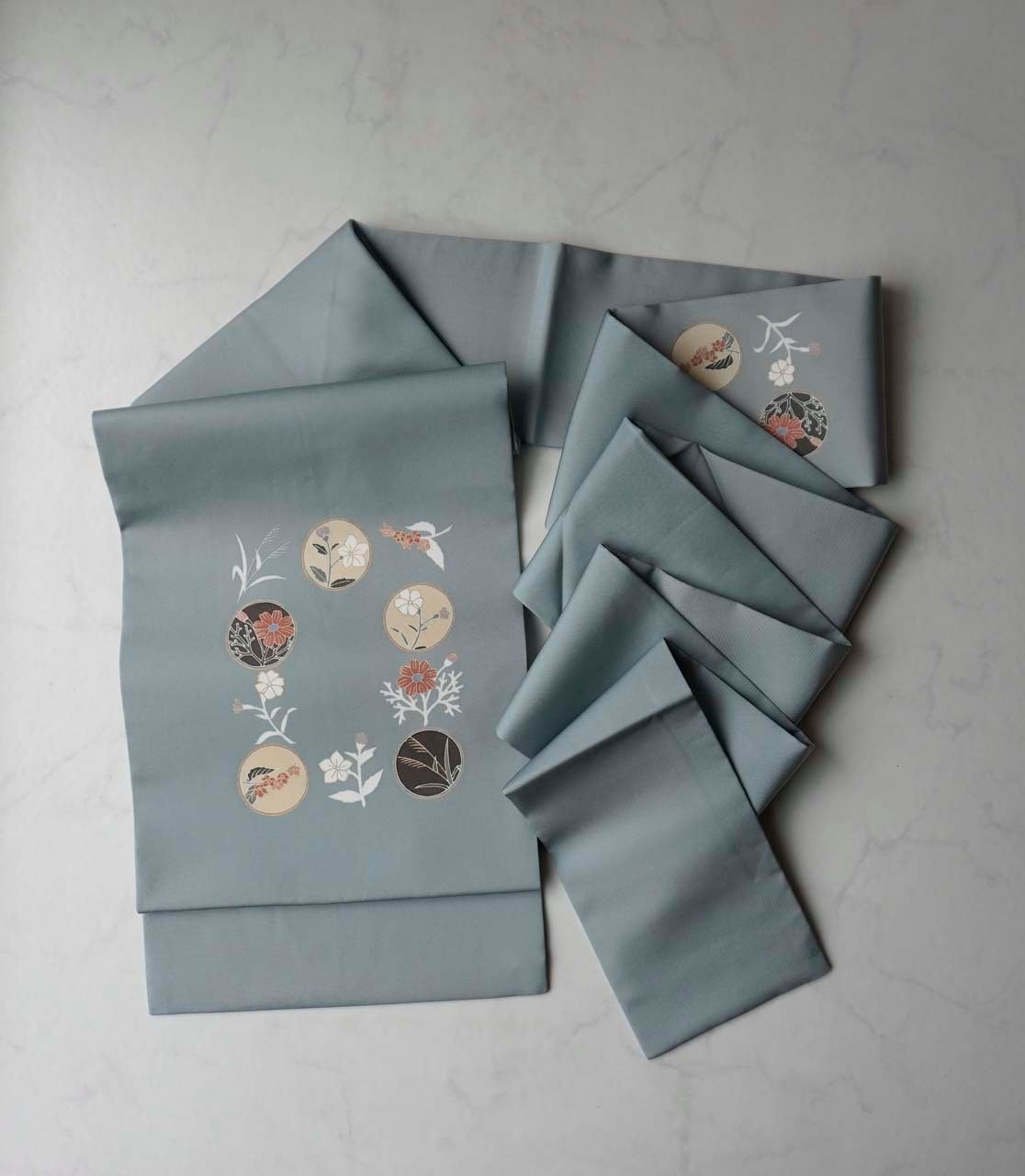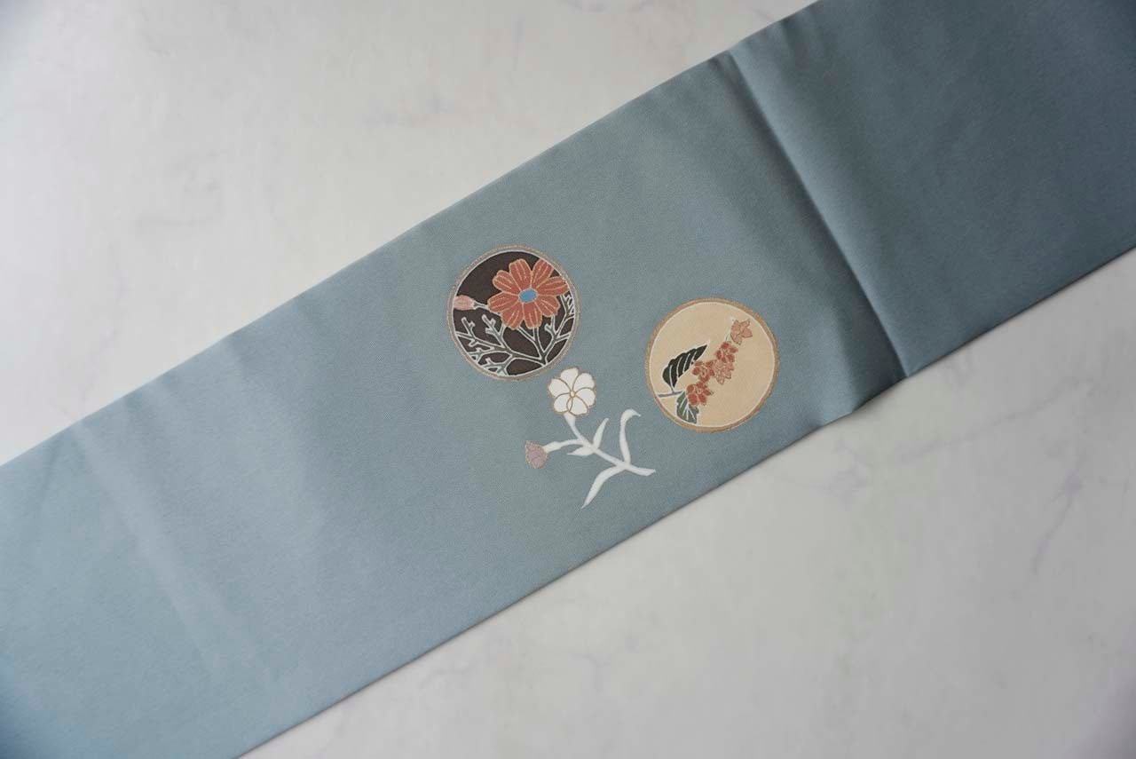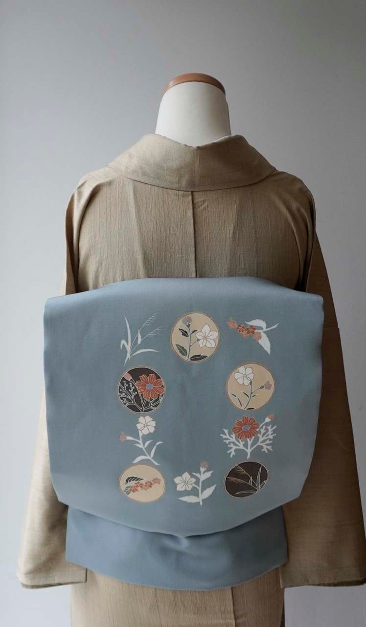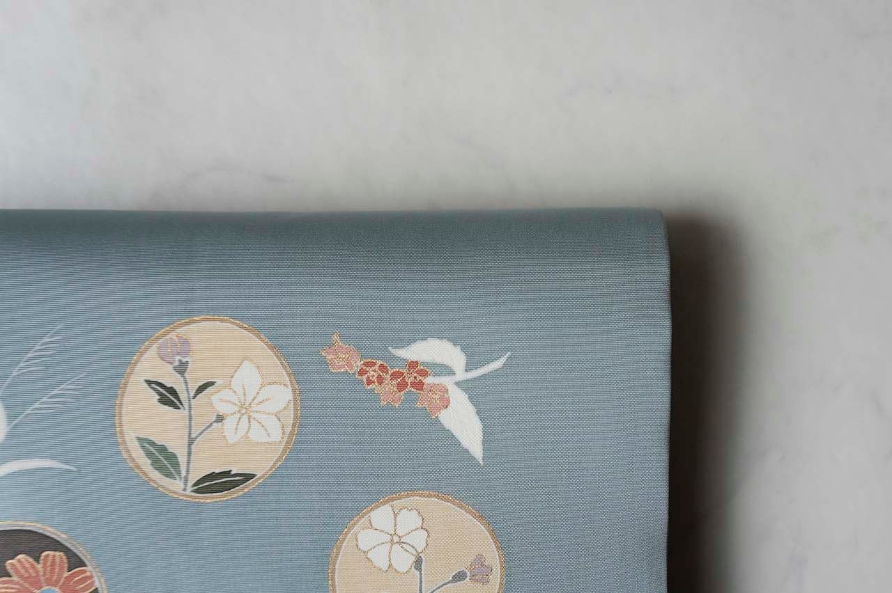 帯地には、草花を丸の中に収めた花丸文が