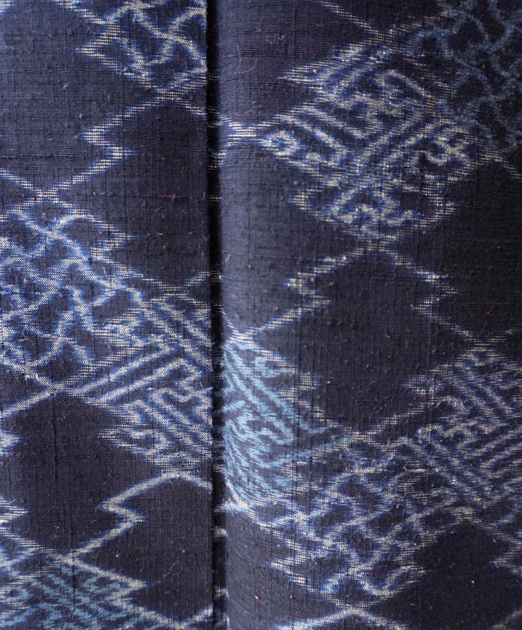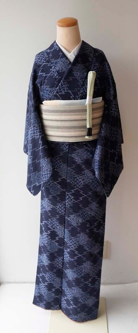 【袷】濃藍地 松皮菱に紗綾形・分銅繋ぎ文 紬