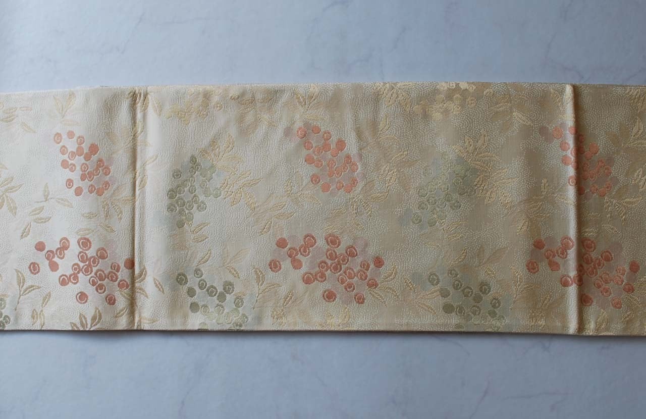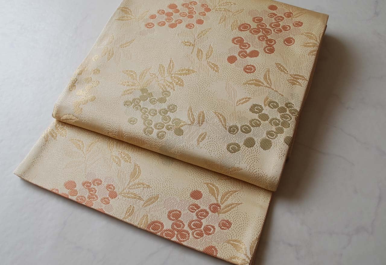 蜂蜜色の帯地に抽象植物文のふくろ帯です。