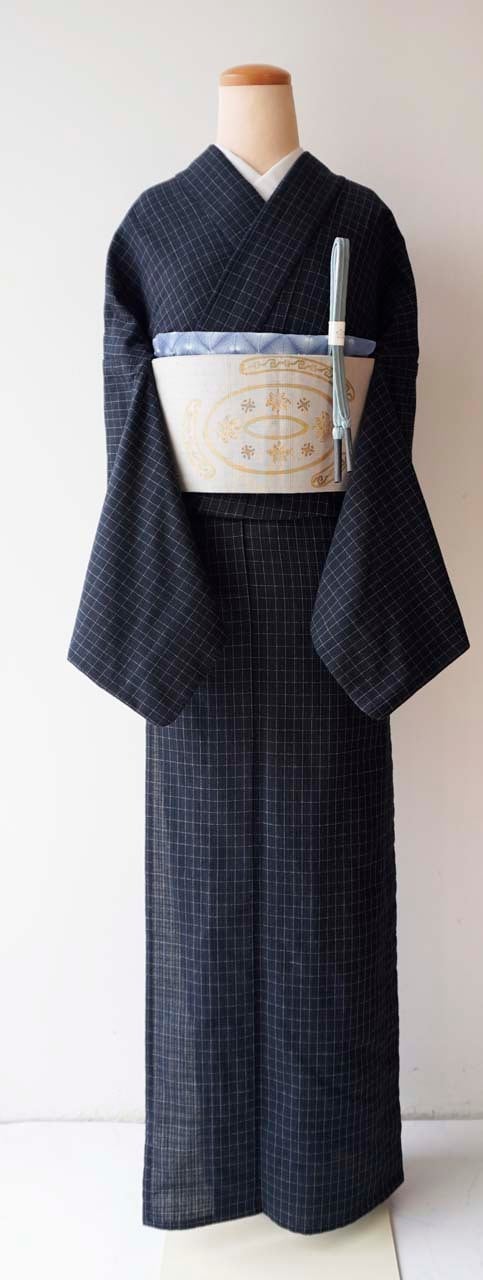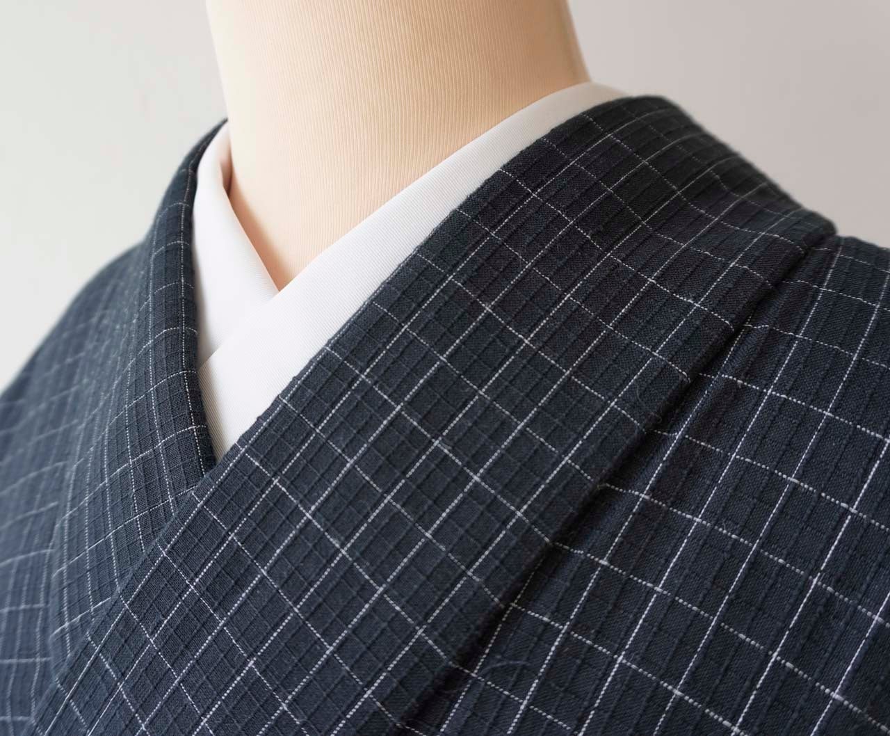 【単衣】紺仁工房 片貝染紅梅綿麻 黒紺系 格子文 仕立上がり品