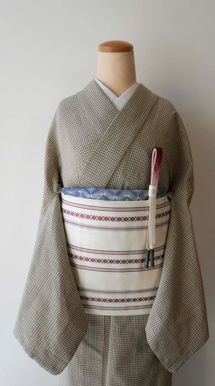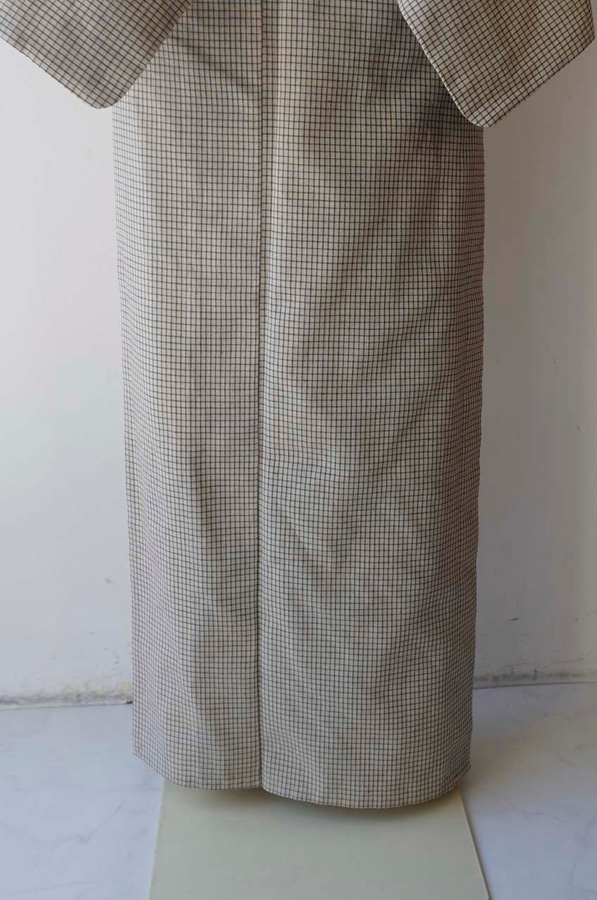 【単衣】紺仁工房 片貝染紅梅綿麻 白橡色地 格子文 仕立上がり品
