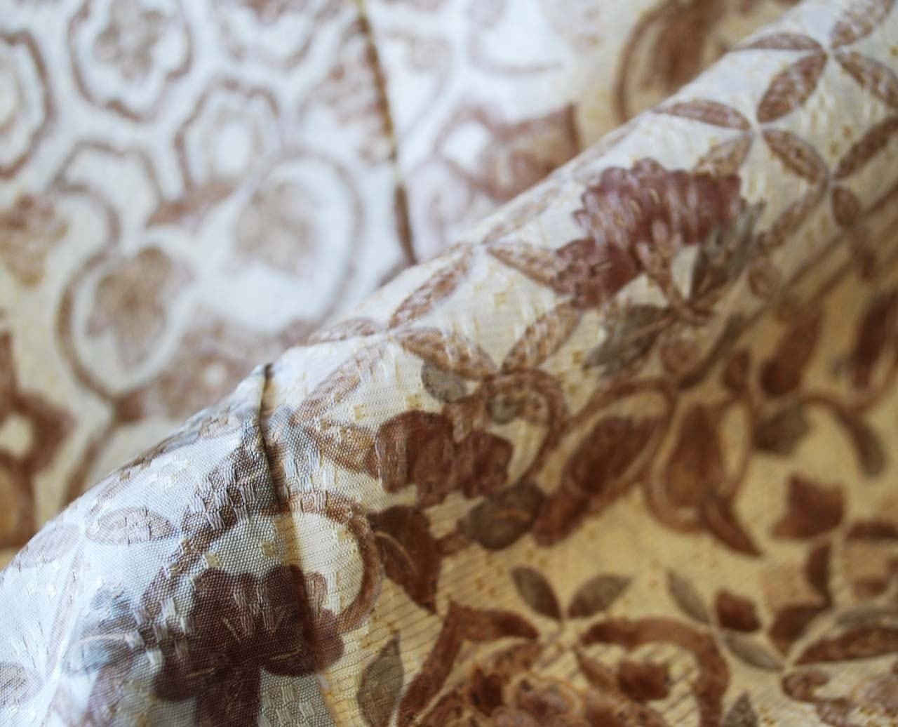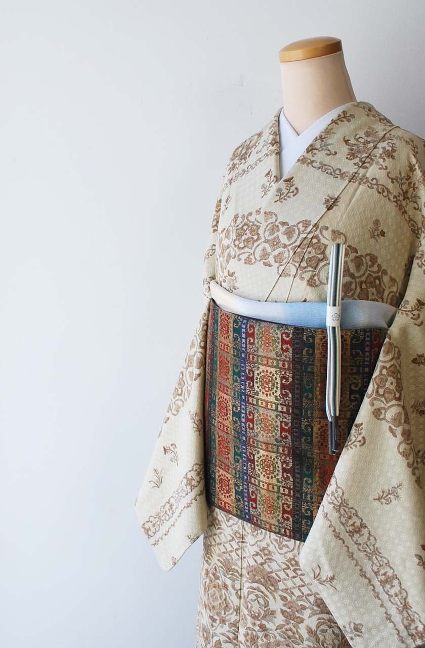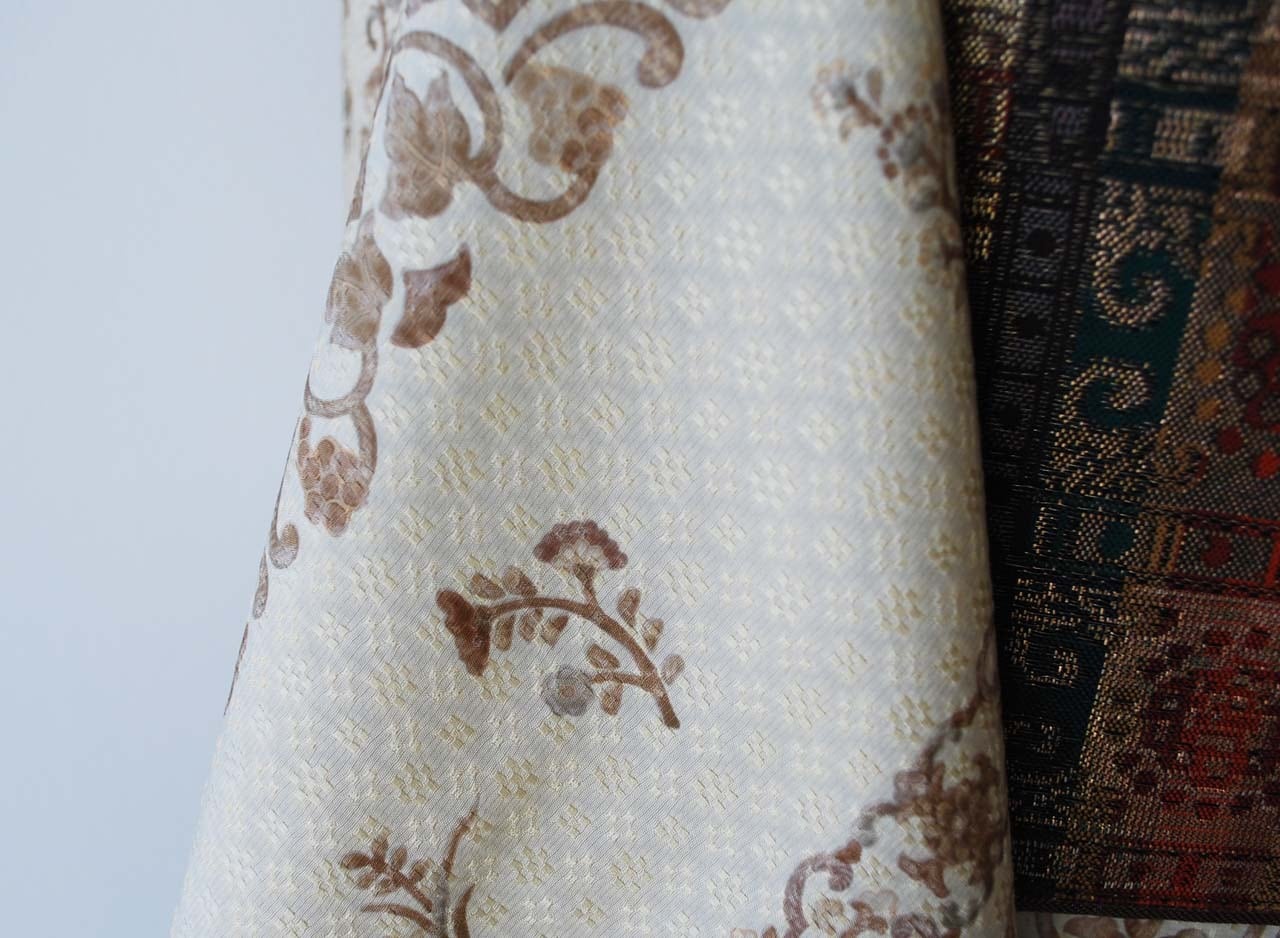 蒸栗色、花織地紋に更紗文の