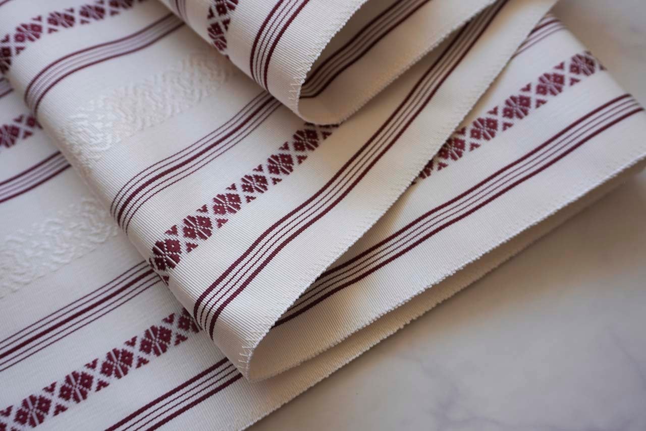 【なごや帯】白×葡萄色 献上柄 博多八寸なごや帯