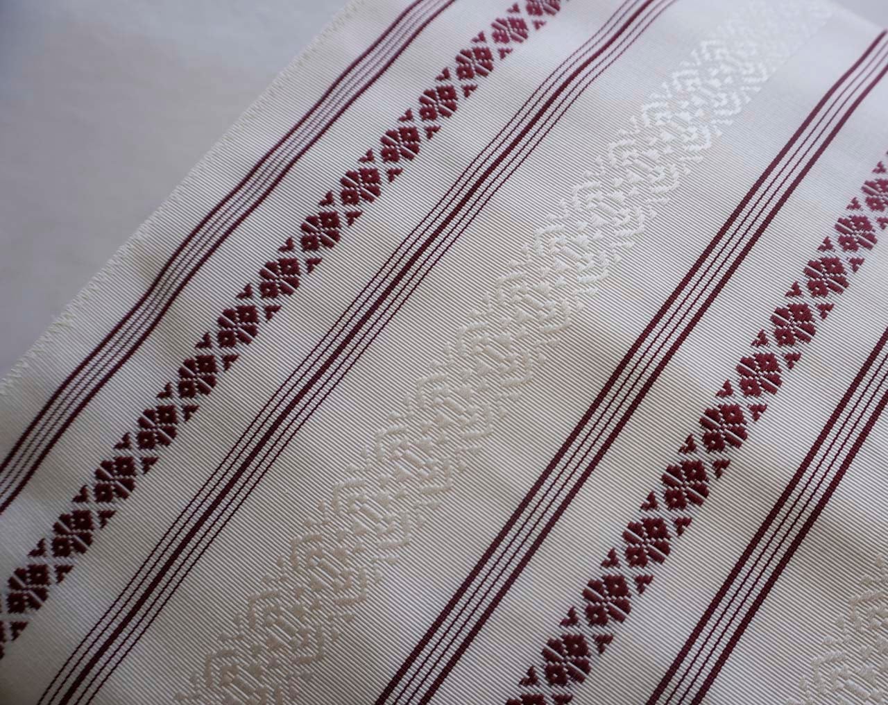 細い縞と共に規則正しく繰り返される意匠は