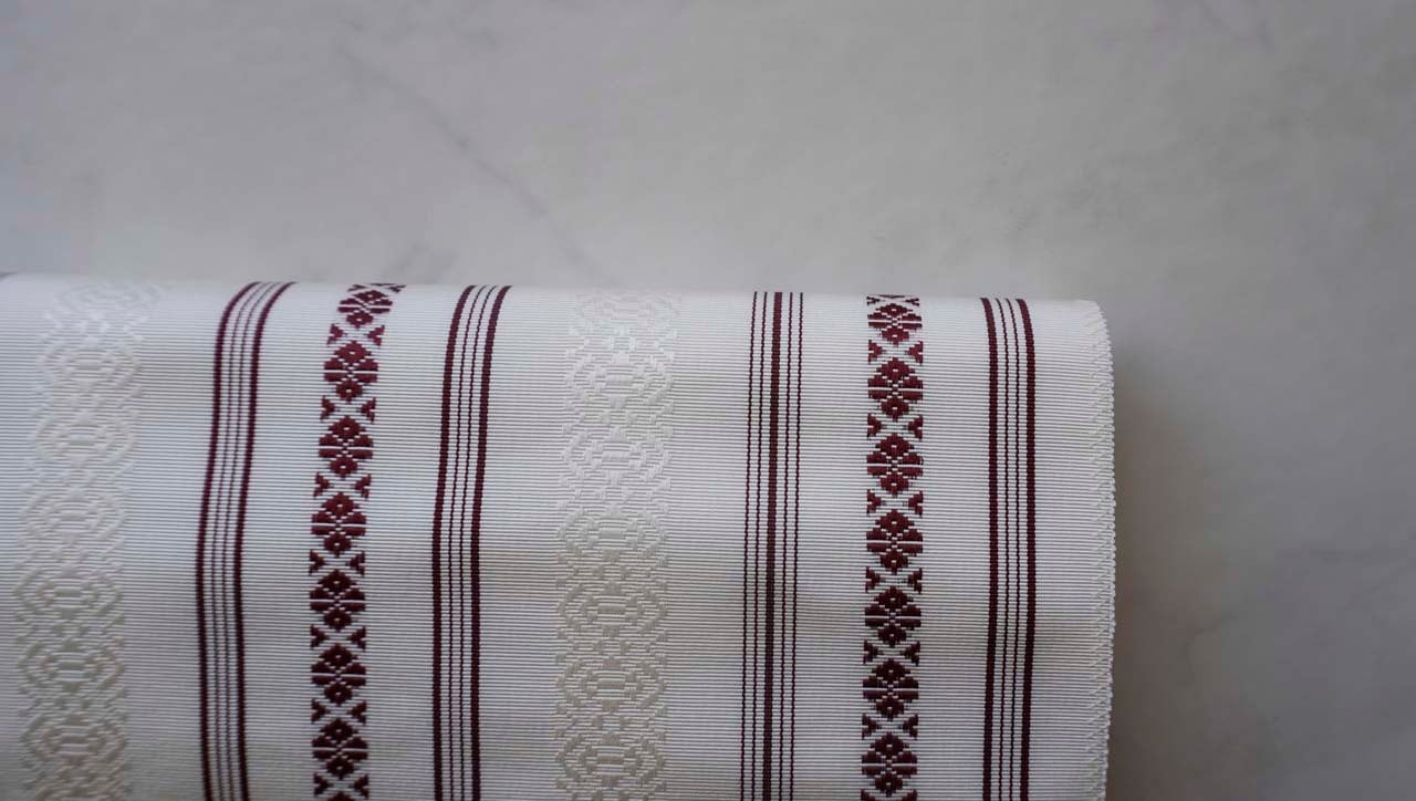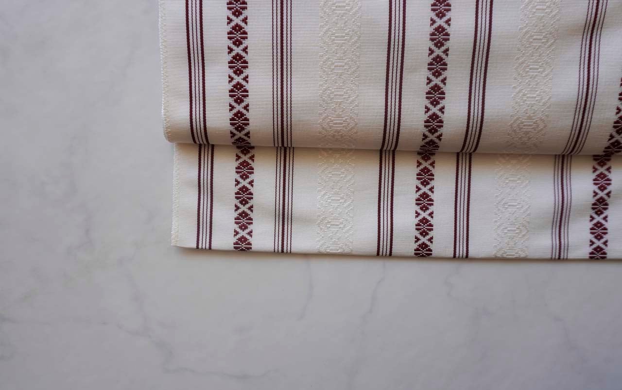 さわやかな白地に葡萄色の献上柄を配した