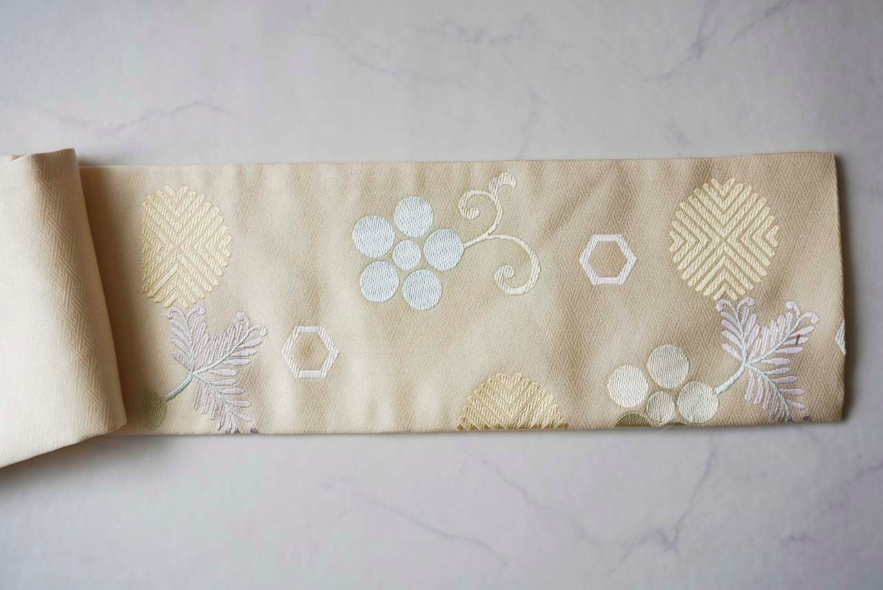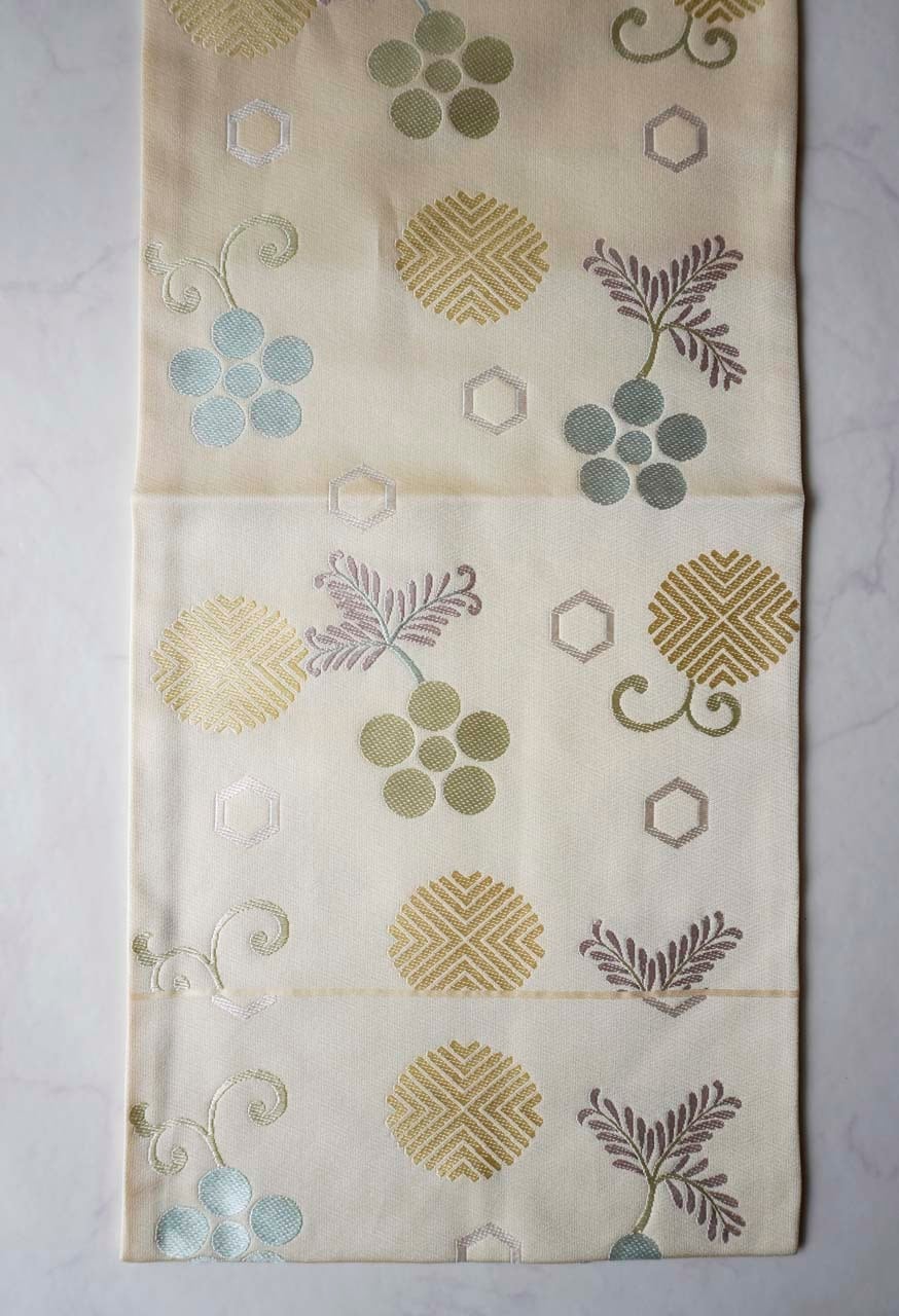 【なごや帯】西陣・都 鳥の子色地 天神笹蔓文 なごや帯