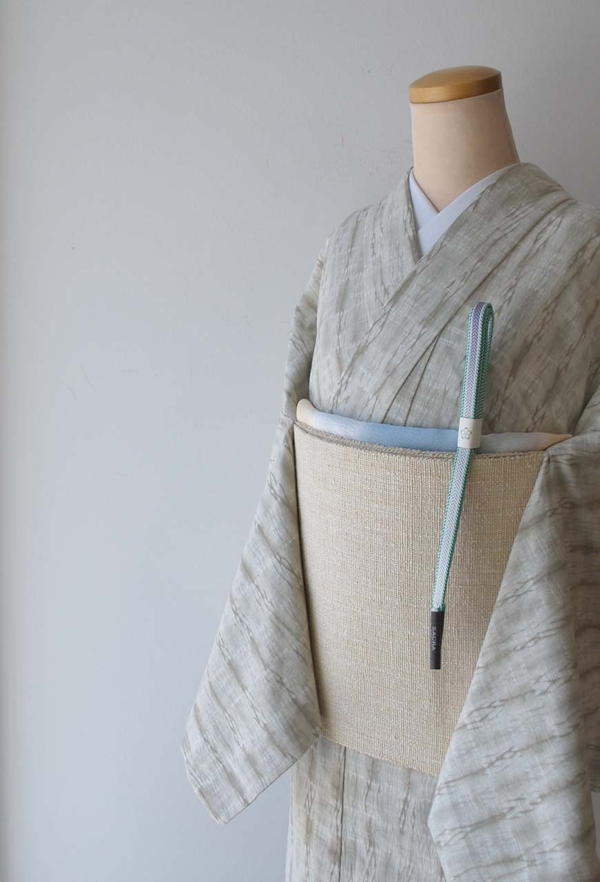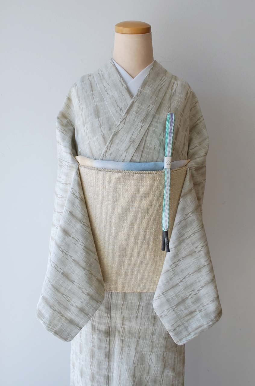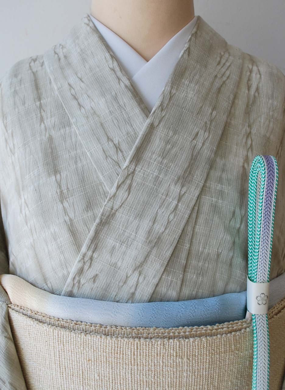 【単衣】小千谷織物 紺仁謹製 越後片貝絞り 利休色系縫い絞り 仕立上がり品