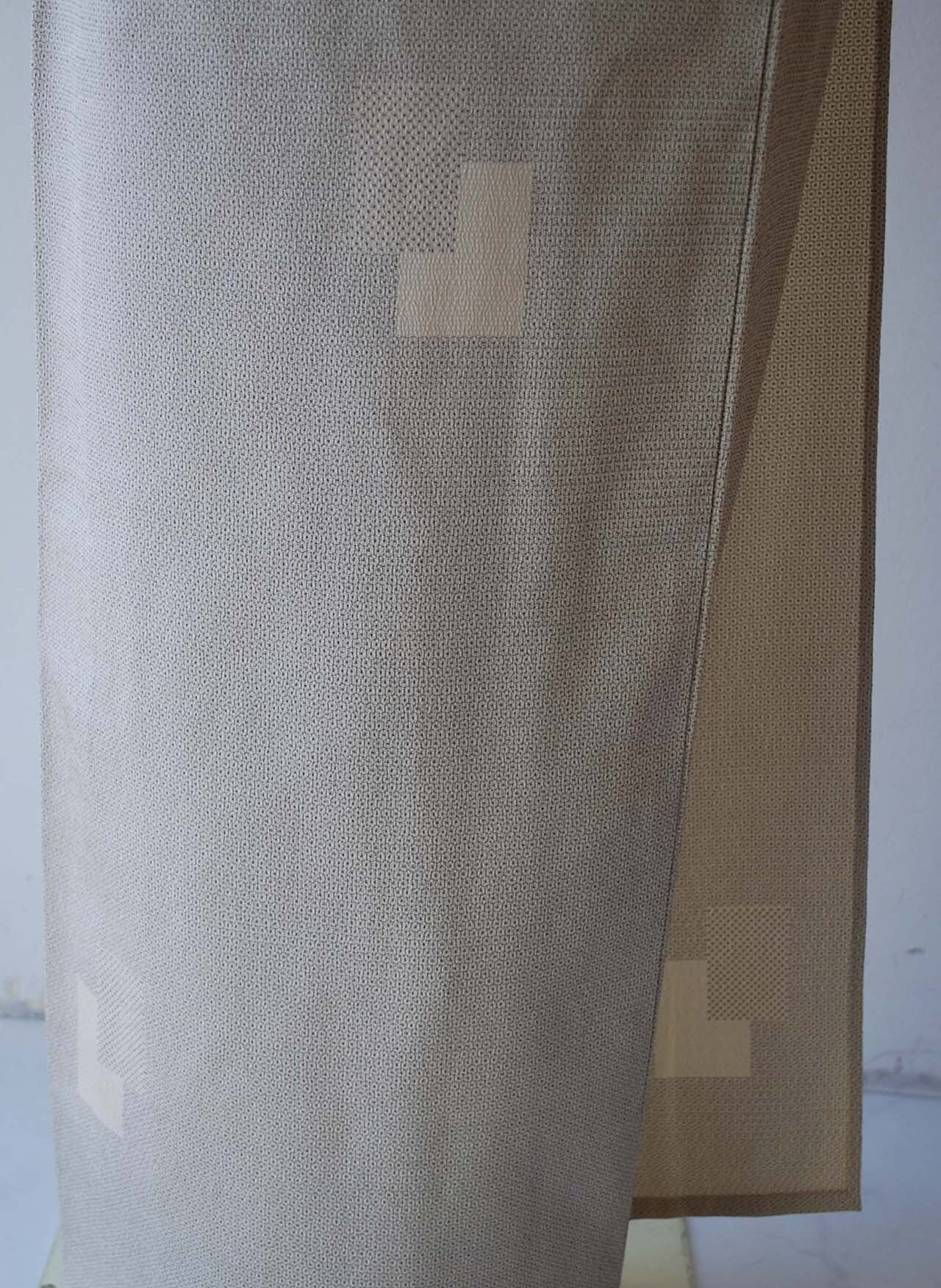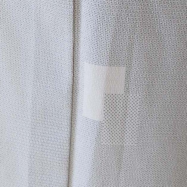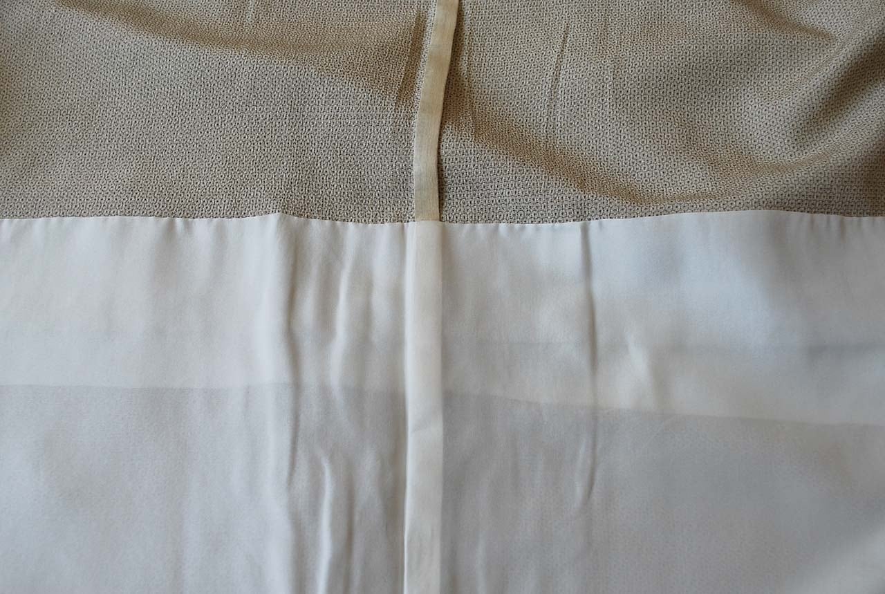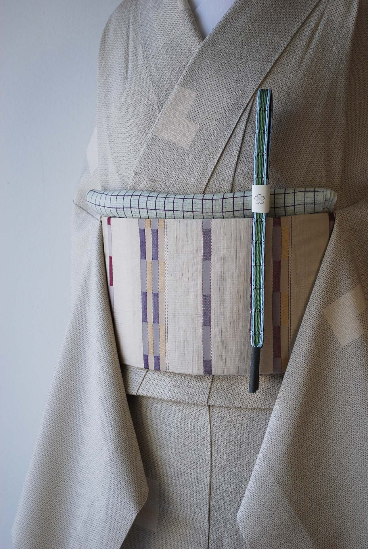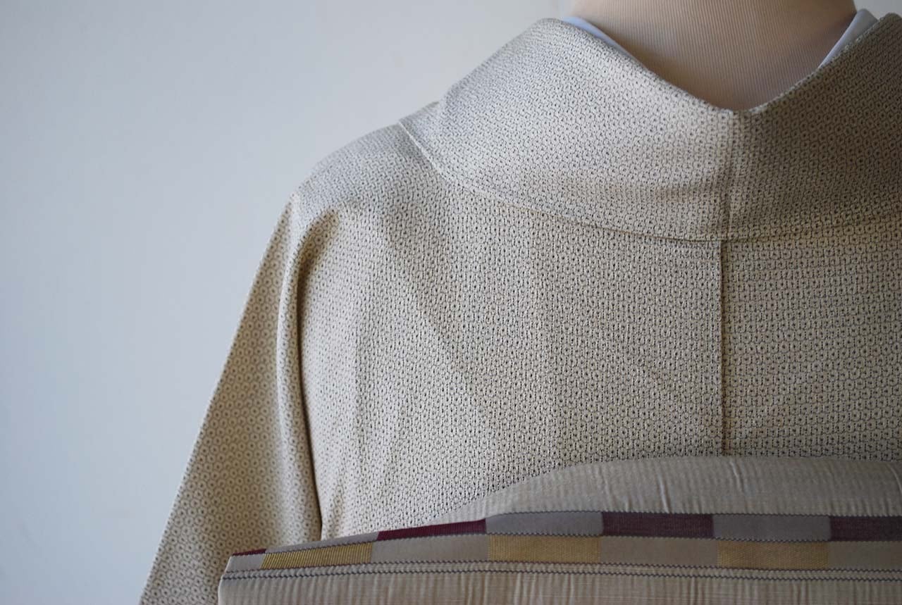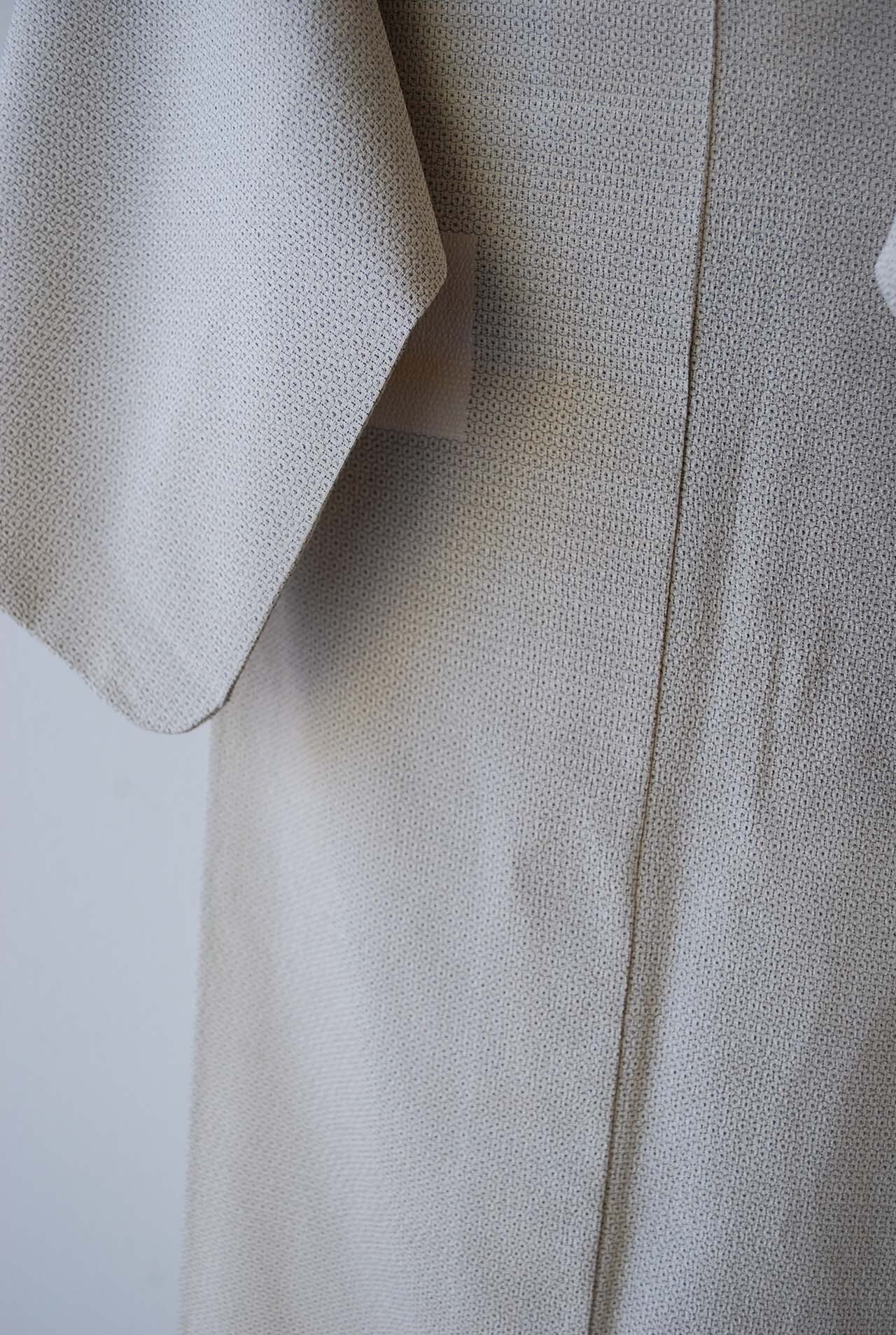 生成りに墨色の糸で細かな亀甲絣が施されています。