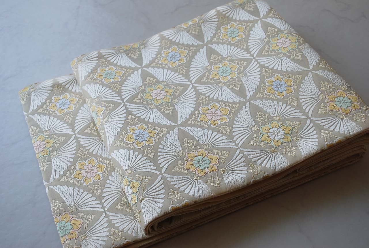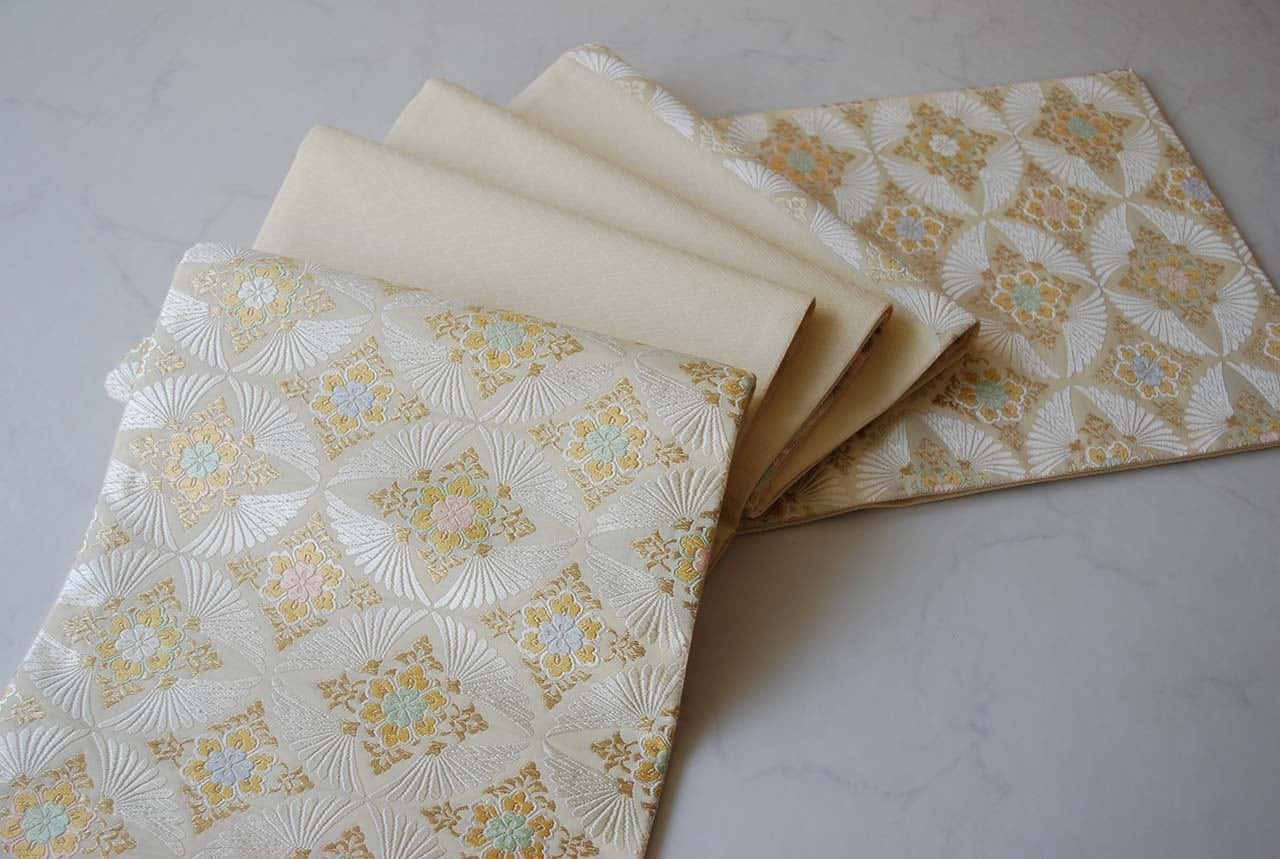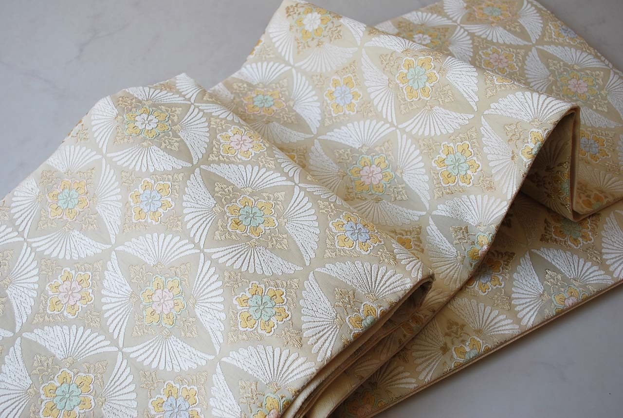 【ふくろ帯】西陣岡文 鳥の子色地 花菱七宝繋ぎ 唐織ふくろ帯