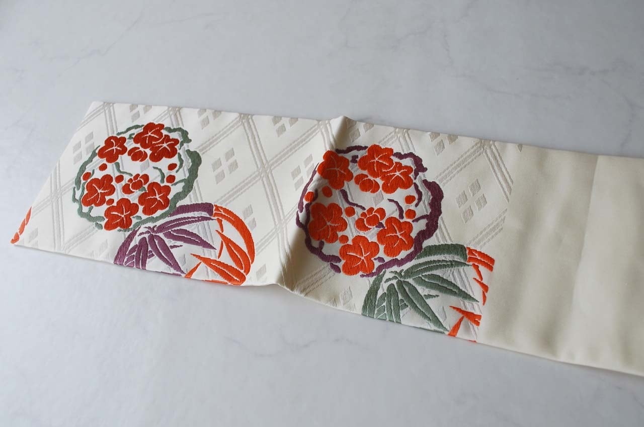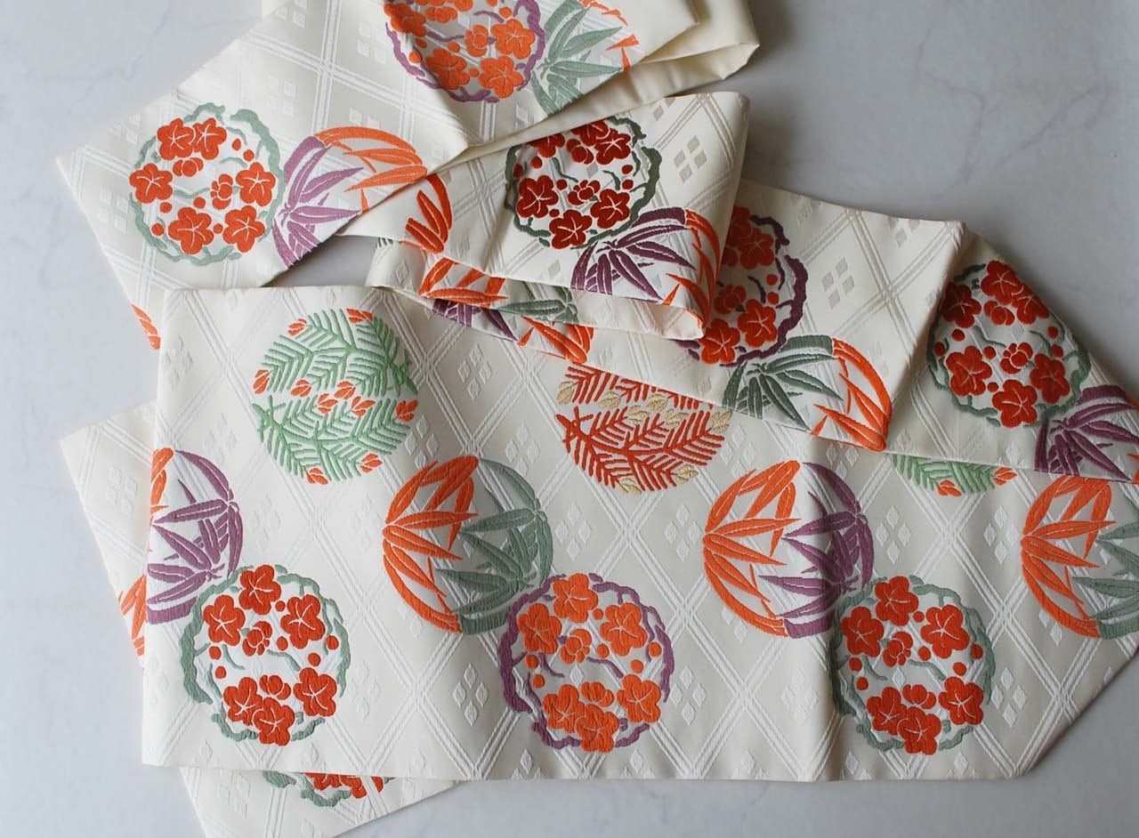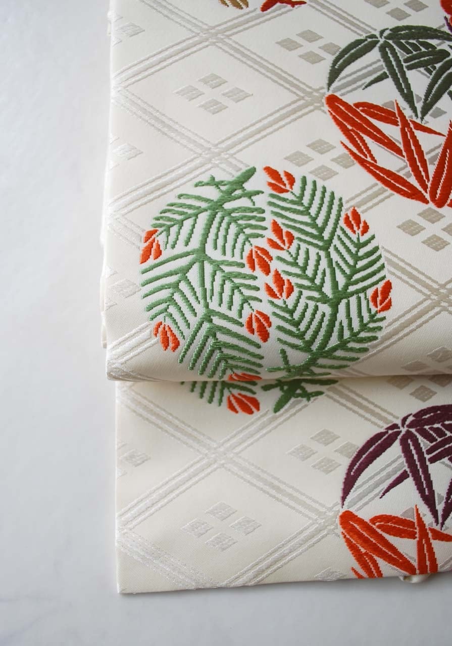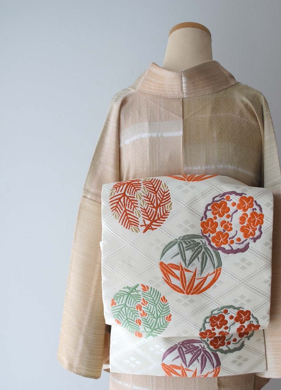 【なごや帯】人間国宝 喜多川平朗 生成り色 丸文松竹梅 なごや帯