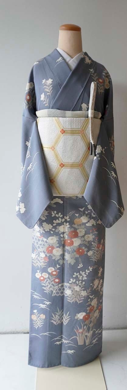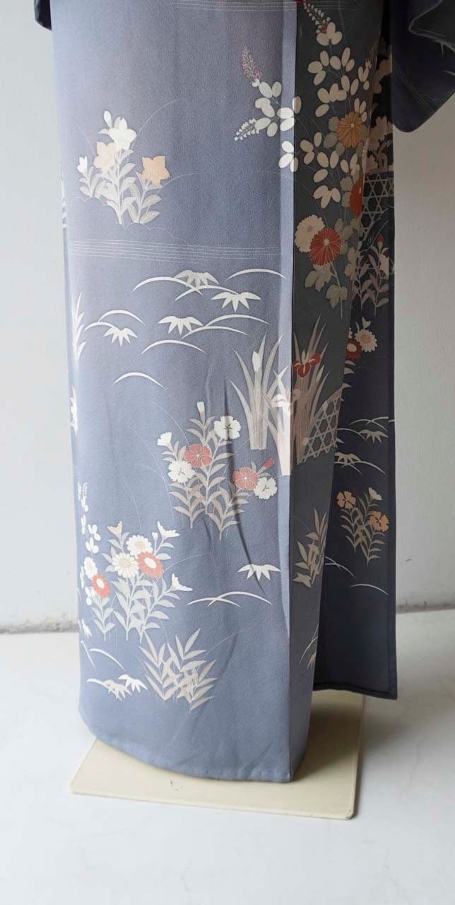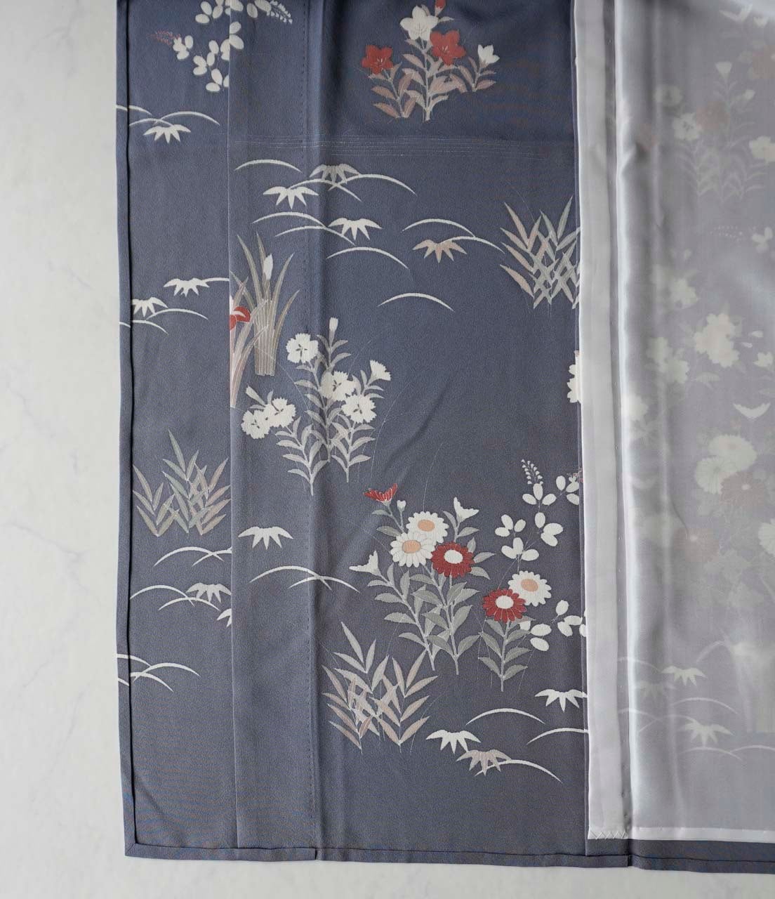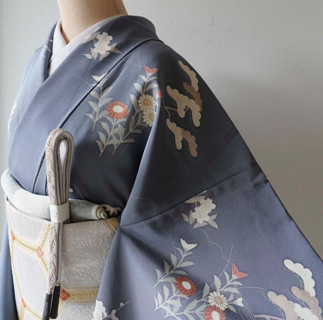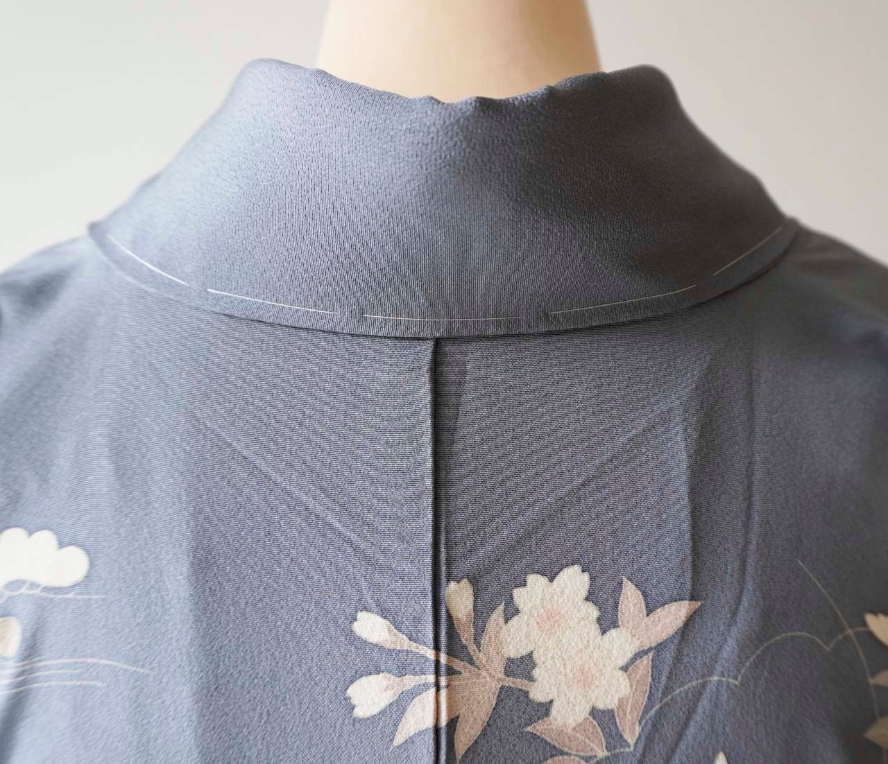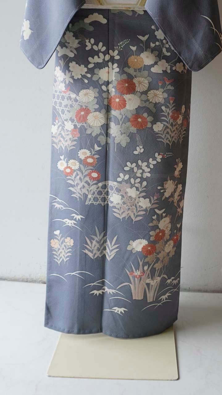 【単衣】灰青紫系色地 松笹梅に四季花文 訪問着