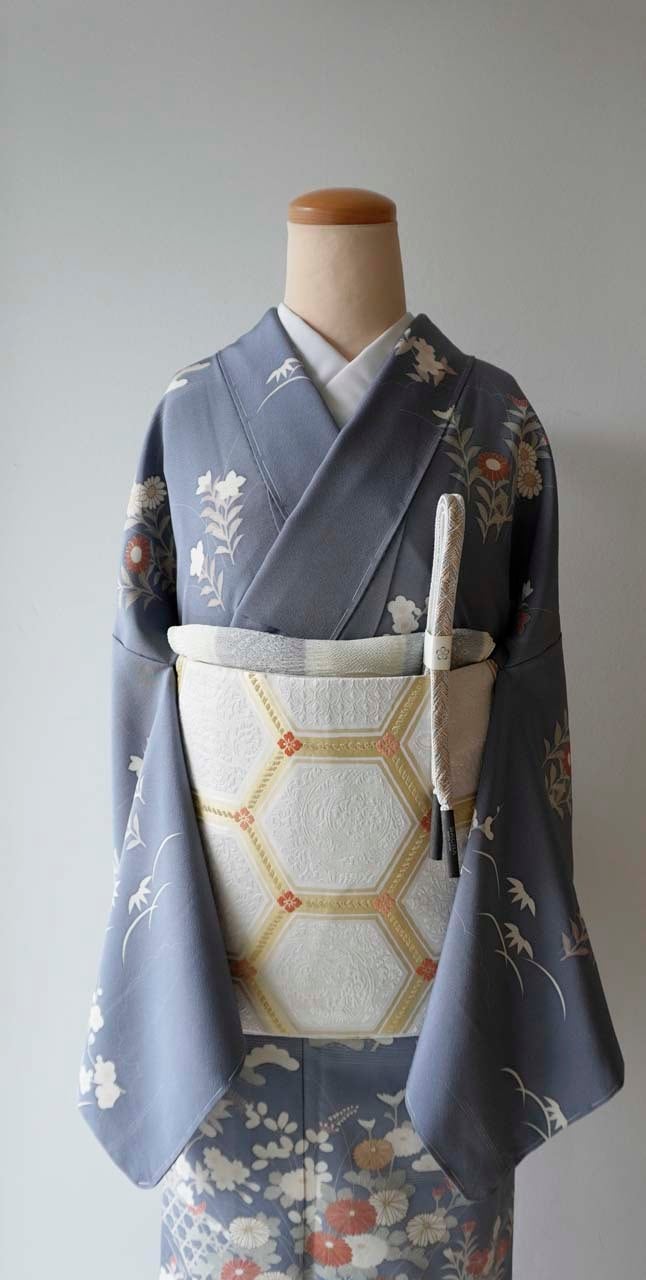 裾から肩へと広がる文様は、霞や雲、垣根の